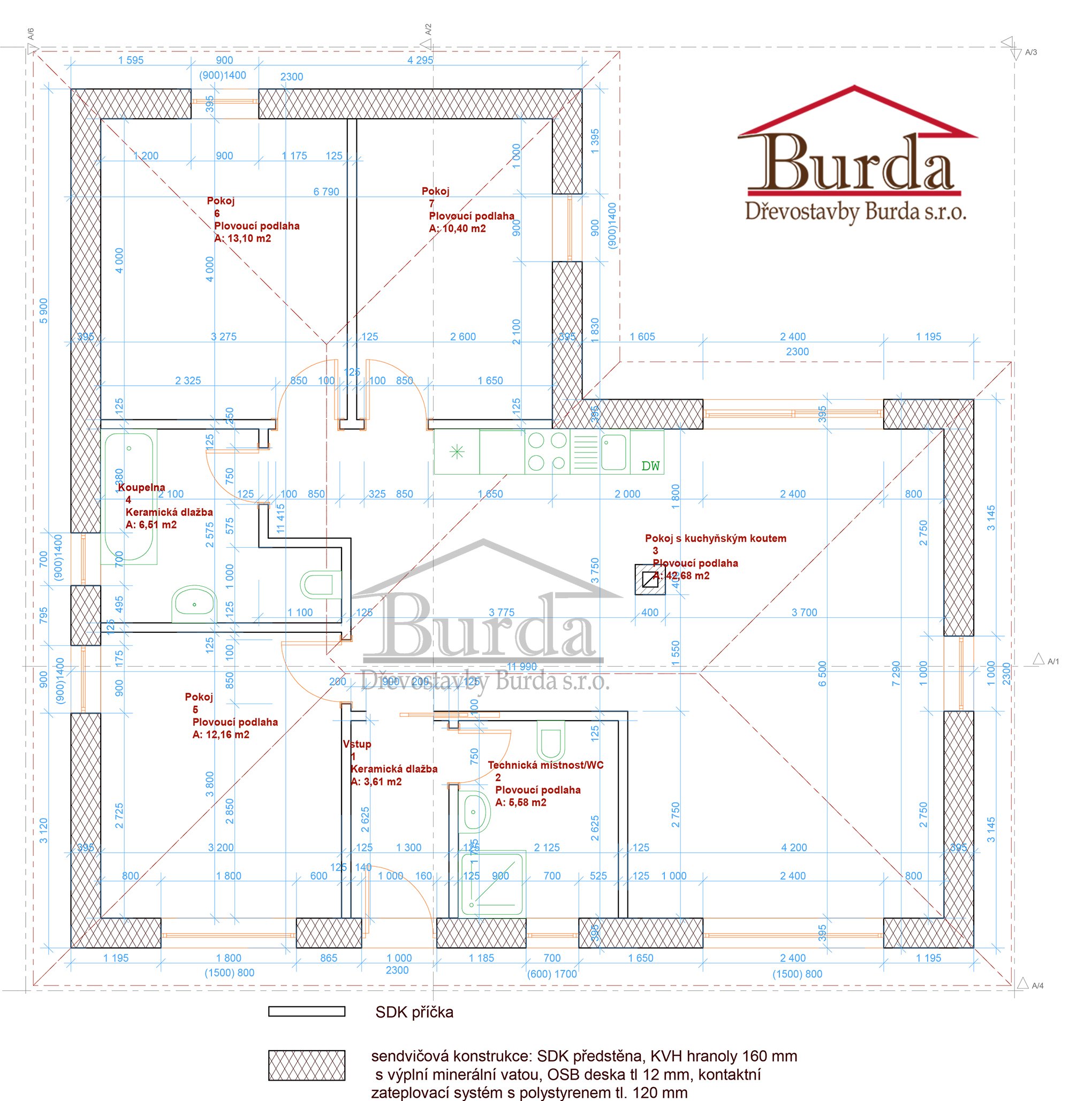 - výztuhy pro zavěšení (kuchyňského nábytku, skříněk v koupelně a na WC, dále pak pro televizi v obývacím pokoji) jsou z OSB desky tl. 22 mm